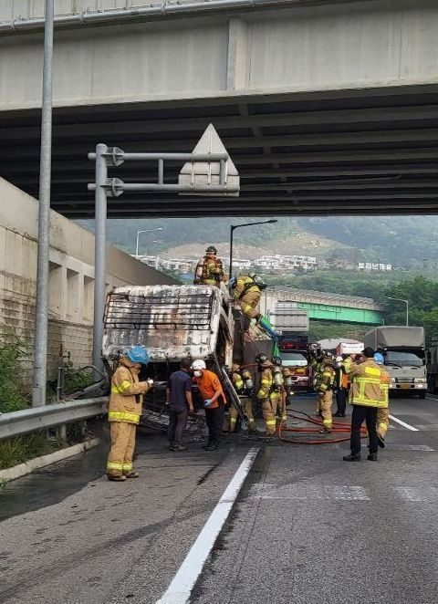 18일 오전 6시28분께 경기 용인시 처인구 포곡음 영동고속도로 서용인 분기점 인근을 달리던 8t 트럭에서 불이 났다.