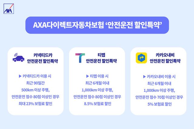 AXA손해보험은 개인용 AXA다이렉트자동차보험 내 평소 안전운전을 실천하는 고객을 대상으로 납입 보험료의 일정액을 할인해주고 있다고 18일 밝혔다. 현재 운영 중인 안전운전 할인 특약에는 ‘커넥티드카 안전운전 할인특약’, ‘티맵 안전운전 할인특약’, ‘카카오내비 안전운전 할인특약’ 등이 있으며, 피보험자 차량 내 연동장치 또는 휴대전화 내비게이션 앱을 통해 산정된 안전운전점수를 기반으로 한다.