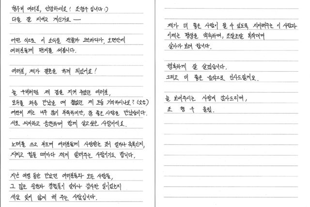 조형우는 손편지를 통해 예비신부에 대해 "참 좋은 사람"이라며 "서로 의지하고 응원하며 함께 살고 싶은 사랑이에요"라고 애정을 드러내기도 했다.