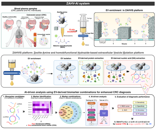 대장암의 조기진단을 목표로 혈장 샘플에서 세포외 소포체를 ZAHVIS 플랫폼으로 신속하게 분리한 뒤, 내부의 RNA를 분석해 인공지능 기반으로 최적의 바이오마커 조합을 도출하는 ‘ZAHV-AI’ 시스템을 개발했다. 이 시스템은 비침습적 방식으로 기존 단일 마커 기반 검사보다 높은 정확도를 보이며, 병기별 최적 조합을 통해 조기 대장암까지 정밀하게 진단할 수 있다.