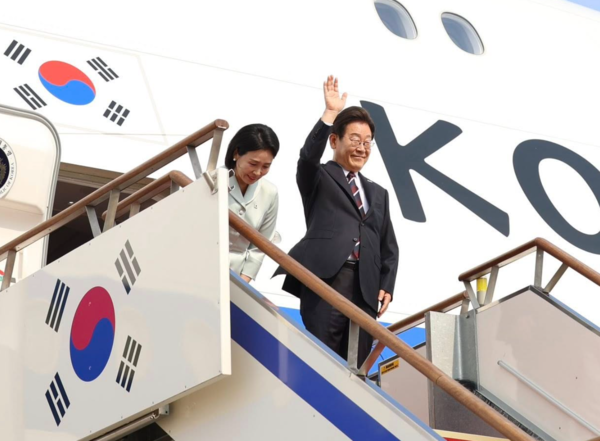 주요 7개국(G7) 정상회의 참석을 마친 이재명 대통령과 부인 김혜경 여사가 17일(현지 시간) 캐나다 앨버타주 캘거리국제공항에 도착해 공군 1호기에 탑승하며 인사하고 있다. /이재명 대통령 페이스북 갈무리