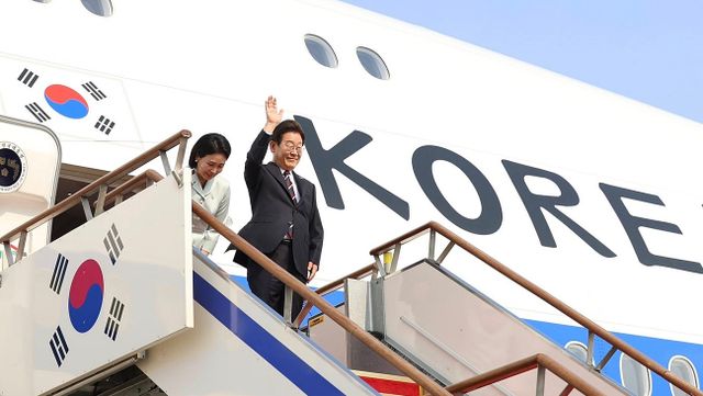 이재명 대통령과 김혜경 여사가 17일(현지 시각) 51차 주요 7개국(G7) 정상회의 일정을 마치고 캐나다 캘거리국제공항에서 귀국하며 공군 1호기 올라 인사하고 있다. / 연합뉴스