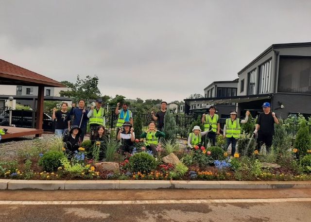 어김없이 한여름의 따사로운 햇볕이 내리쬐었던 이날 오전, 행복정원 조성을 위해서 모인 단원을 포함한 25명은 운정1리 마을안길 부지에 왕벚나무, 레드로빈, 메리골드 등 26종의 꽃과 수목을 심었다.