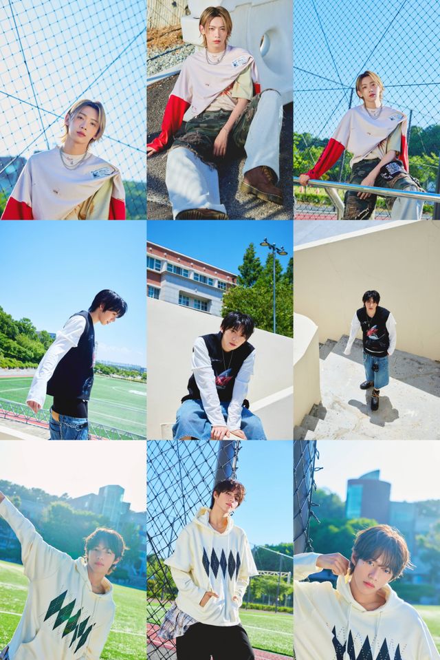 마지막으로 박주원은 펜스에 기대거나 서서 차분하고 시크한 무드를 풍기고, 즈언은 축구 골대를 배경으로 다채로운 시선과 포즈를 취하며 청량함을 발산한다. 다이스케는 귀여운 헤어스타일에 자전거를 타고 운동장을 누비는 모습으로 순수한 소년미를 드러낸다.