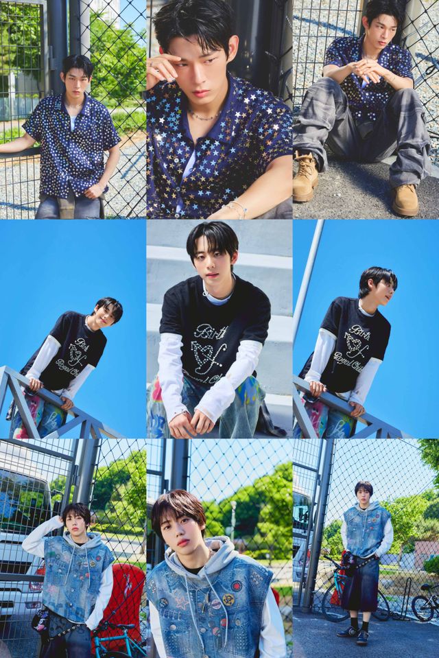 먼저, 개인 컷에서는 멤버들이 각자 지닌 개성이 선명하게 드러난다. 스티븐은 특별한 포즈 없이도 강렬한 눈빛과 표정만으로 시선을 단번에 사로잡는다. 서정우는 푸른 하늘과 잘 어울리는 봄날의 햇살 같은 비주얼을 자랑하고, 차웅기는 무심한 듯한 시선과 여유로운 포즈로 쿨한 존재감을 발산한다.