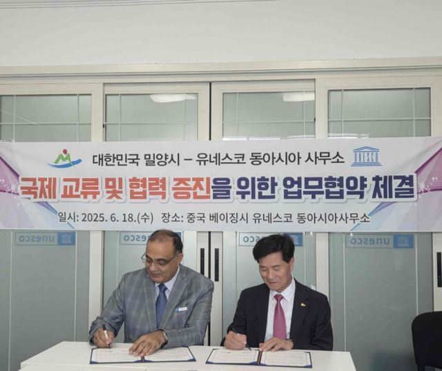 [파이낸셜경제=김예빈 기자] 밀양시는 18일 중국 베이징시에서 유네스코 동아시아사무소(소장 사바즈 칸, Shahbaz Khan)와 공식 업무협약을 체결하며 유네스코 창의도시 지정을 위한 실질적인 국제협력 기반을 마련했다고 밝혔다.