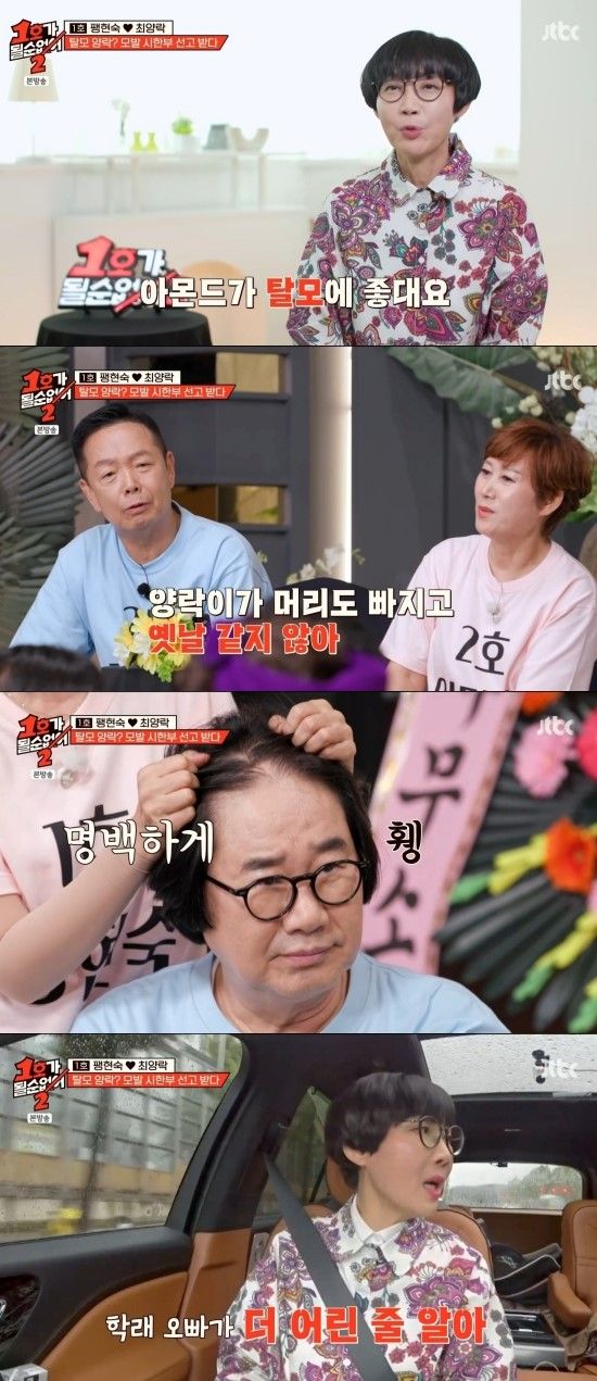 이동하면서 팽현숙은 모발 이식 성공 사례인 김학래를 언급하면서 "20살부터 봤는데 그때부터 대머리였다. 인물도 (최양락이) 훨씬 나은데, 지금 보면 학래 오빠가 역전했다. 숱이 많아졌고, 사람들은 학래 오빠가 더 어린 줄 안다. 그 말에 충격을 받았다"라고 말했다. 김학래가 최양락보다 8살이 많다.