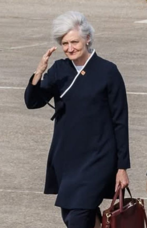 뉴시스 보도에 따르면, 16일 성남 서울공항에는 강훈식 대통령비서실장과 더불어민주당 민병기 원내대표, 우상호 정무수석, 고기동 행정안전부 장관 직무대행 등이 나와 이 대통령을 배웅했다. 이들 틈에 남색 두루마기 한복을 차려입은 은발의 서양 여성이 함께 있어 이목이 집중됐다.