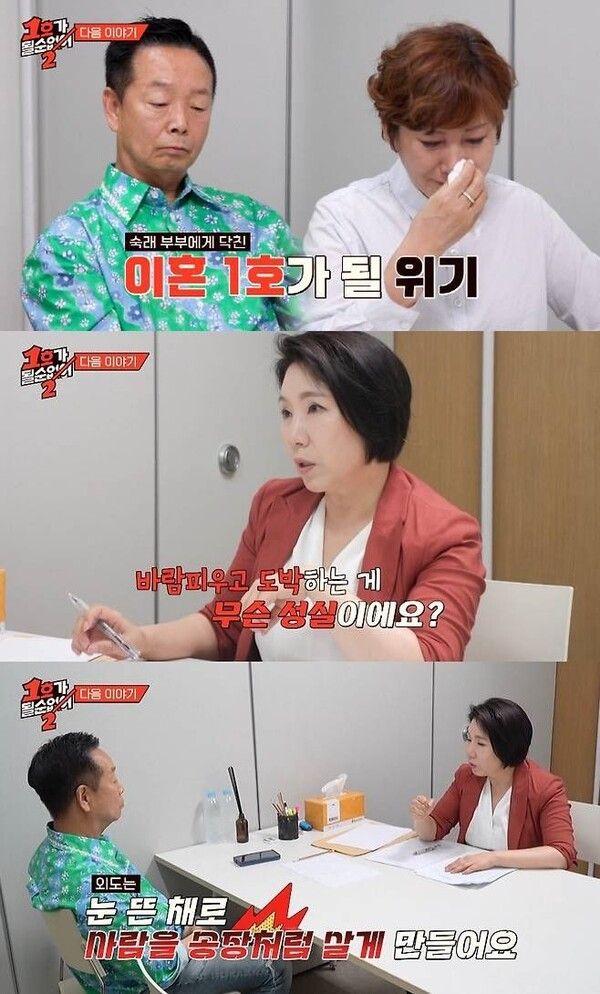 뉴시스 보도에 따르면, 18일 JTBC '1호가 될 순 없어' 시즌2 방송 말미 예고편에선 김학래·임미숙 부부가 심리학자 이호선에게 상담 받는 모습이 그려졌다. 이호선은 김학래에게 "이런 남자랑 누가 사느냐. 바람 피우고 도박하는 게 성실한 거냐"면서 "(외도는) 눈 뜬 채로 사람을 송장처럼 살게 만든다. 아내와 이혼하고 싶느냐"고 물었다.