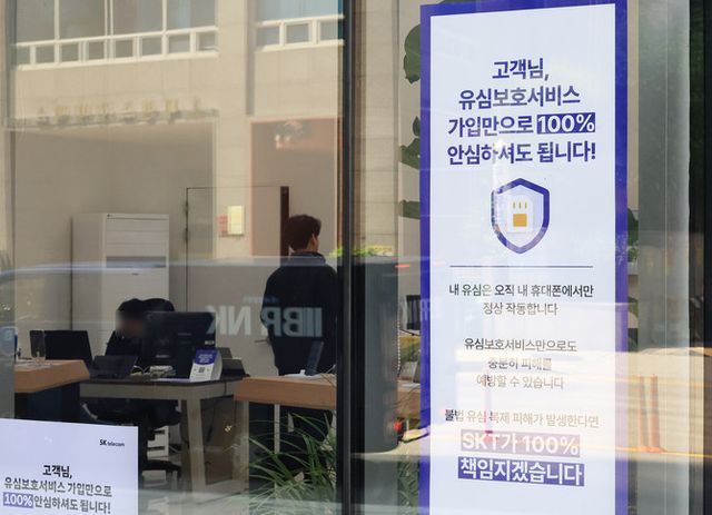 서울 시내 한 SK텔레콤 대리점에 유심 관련 안내문구가 붙어 있는 모습. ⓒ 연합뉴스