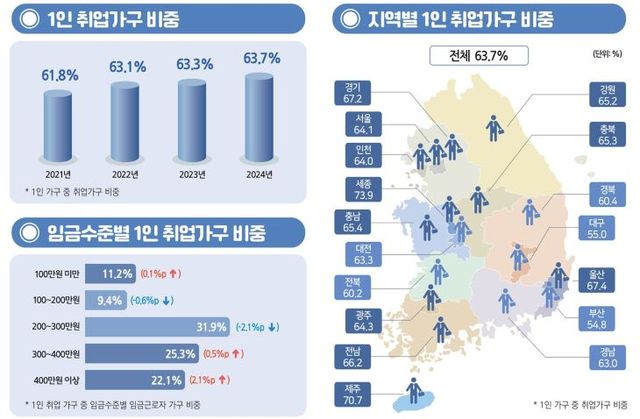 한편 전국 1인 가구는 1년 새 60만 가구 넘게 늘면서 800만 가구(800만3000가구)를 넘어섰다. 이 중 취업 가구는 510만 가구로 42만6000가구 증가했다.