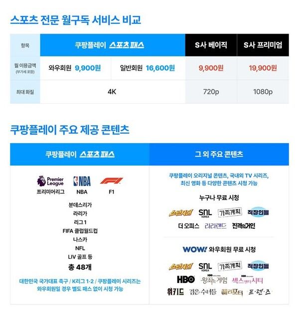 뉴시스 보도에 따르면, 월 1만6600원으로 쿠팡플레이에서 제공하는 모든 스포츠 경기를 제한 없이 볼 수 있다. 기존 쿠팡 와우회원은 가격 변동 없이 월 9900원 할인 요금이 그대로 적용된다.