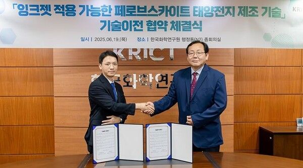뉴시스 보도에 따르면, 한국화학연구원은 19일 ㈜고산테크와 페로브스카이트 태양전지를 대량으로 생산할 수 있는 잉크젯 프린팅용 재료 및 공정기술을 이전하는 계약을 체결했다고 밝혔다. 이날 체결식에는 화학연 이영국 원장, ㈜고산테크 김광수 대표 등 양기관 관계자 8명이 참석했다.
