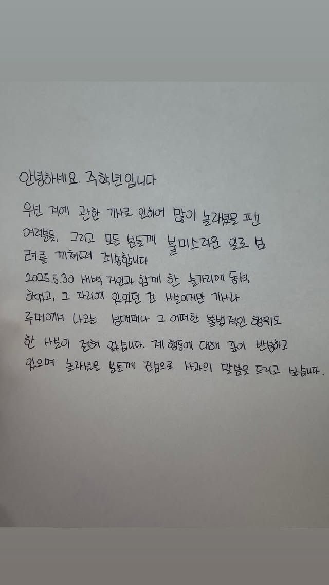 주학년은 "우선 저에 관한 기사로 인해 많이 놀라셨을 팬 여러분들, 그리고 모든 분들께 불미스러운 일로 심려를 끼쳐 죄송하다. 2025년 5월 30일 새벽 지인과 함께 한 술자리에 동석했고, 그 자리에 있었던 건 사실이지만 기사나 루머에 있는 성매매나 그 어떠한 불법적인 행위도 한 사실이 전혀 없다"라며 성매매 의혹을 강력 부인했다.