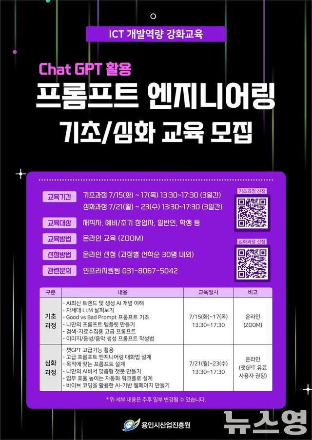 (뉴스영 이현정 기자) 용인시산업진흥원은 ICT(정보통신기술) 인재 양성 및 디지털 기술 활용 역량 제고를 위해 ‘챗GPT 활용 프롬프트 엔지니어링’ 교육을 개설하고 참가자를 모집한다고 밝혔다.