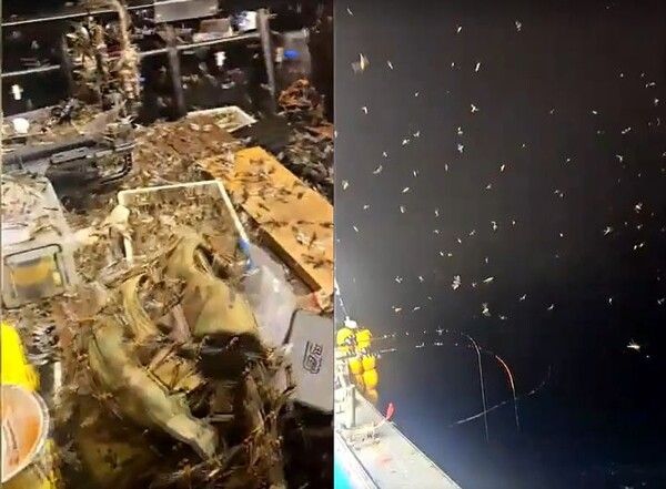 공개된 영상을 보면 수천 마리의 잠자리 떼가 불을 밝힌 낚싯배에 몰려들었고, 잠자리 떼는 낚싯배는 물론, 사람의 몸에도 가득 달라붙었다.
