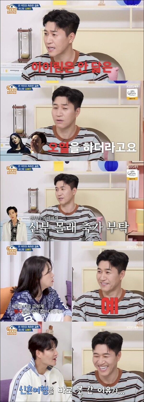 한편, 김종민의 결혼식은 적자설이 돌기도 했다. 이에 김종민은 "적자라기보다는 거의 비슷했다"고 재치 있게 해명했다. 김숙과 김종국은 "지금 급하게 행사를 잡는다더라", "바로 신혼여행을 못 간 이유가 그거냐"고 의혹을 제기해 웃음을 자아냈다. 신혼여행은 다음 주에 간다는 김종민은 "인생에 이렇게 휴가를 빼본 적이 없다. 고스란히 내 시간을 뺀 게 인생 처음이다. '1박2일'도 처음으로 빠진다"며 행복한 새신랑의 면모를 보였다.