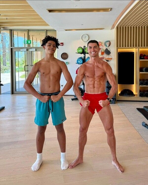 사진 속 호날두는 아들 크리스티아누 호날두 주니어(14)와 함께 상의를 탈의한 채 근육질 몸매를 자랑하고 있다.