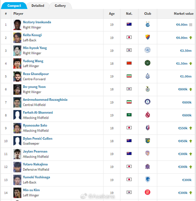 한편 왕위동 아래에 이란 유망주 레자 간디푸르(말라반), 그리고 브라이턴 앤드 호브 앨비언(잉글랜드) 이적이 확정된 윤도영이 이름을 올렸다. 윤도영의 몸값은 이전보다 오른 80만 유로(약 12억원)로 책정됐다.