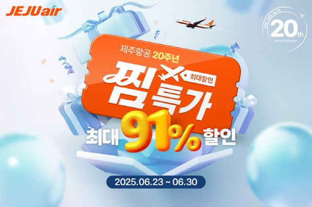 제주항공이 항공권 할인 행사 ‘찜(JJIM) 특가’를 진행한다. 오는 10월 1일부터 내년 3월 28일까지 탑승 가능한 항공권이 대상이다. 국내선은 오는 23일 오전 10시부터, 국제선은 24일 오전 10시부터 30일 오후 5시까지 판매한다. 편도 총액 기준 운임은 국내선 1만1900원부터, 국제선은 동북아 노선의 경우 3만 4900원부터다. 유류 할증료와 공항시설 사용료가 포함된 가격이며, 위탁 수하물 없이 10㎏ 이하 휴대품 1개만 기내 반입 가능하다.