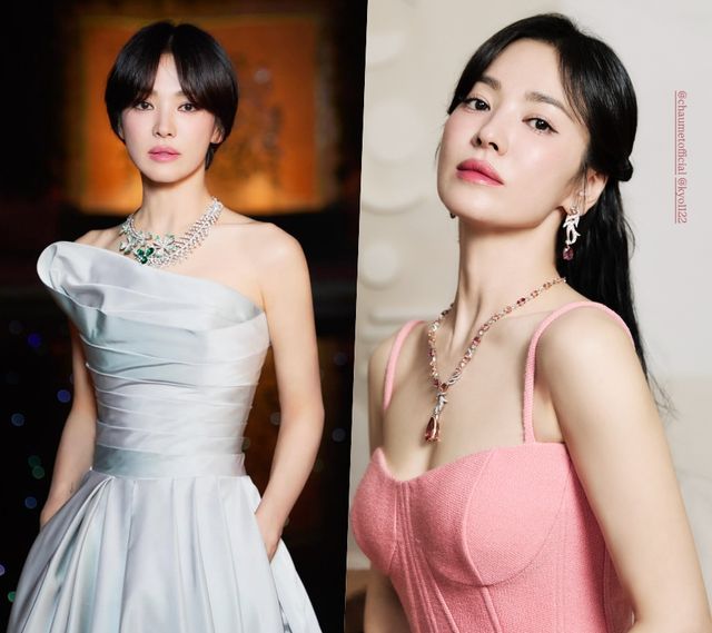 송혜교는 짧은 단발 스타일과 긴 웨이브 헤어를 각각 선보이며 전혀 다른 매력을 뽐냈다. 실버 톤의 오프숄더 드레스를 입은 사진에서는 단정한 단발머리로 고급스럽고 절제된 분위기를 자아냈고, 반면 핑크 컬러의 슬리브리스 드레스와 함께한 스타일에서는 자연스럽게 넘긴 긴 생머리로 부드럽고 여성스러운 매력을 강조했다.
