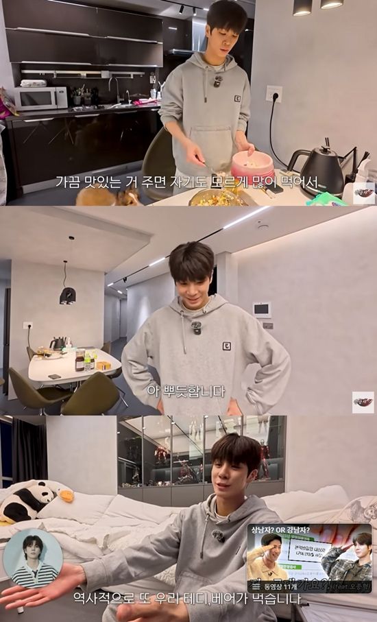 본격적으로 채소를 씻기 시작한 정동원은 "주방에서 처음 요리하는 거다. 한 번도 안 해봤다. 진짜 역사적인 날"이라며 감격했다. 그러면서 "테디는 많이 먹는데 베어는 맛있으면 먹고 맛 없으면 입도 안 댄다. 베어가 오늘 먹으면 그러면 저요리 잘하는 거다"라고 했다.
