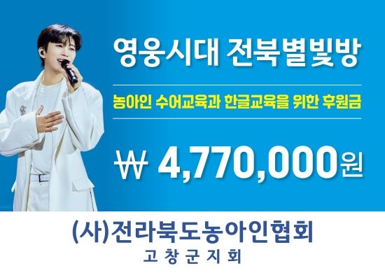 최근 임영웅 팬클럽 '전북별빛방'은 6월 16일 임영웅의 생일을 기념해 사단법인 한국농아인협회 전북특별자치도협회 고창군지회에 477만 원을 후원했다고 밝혔다.