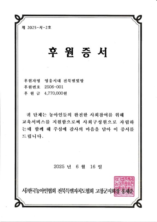 고창군지회에 네 번째 지원한 '전북별빛방'. 홍재춘 고창군지회장은 "농아인의 원활한 의사소통을 위해서는 청인(들을 수 있는 사람)의 수어 교육에 대한 관심이 필요하다"라며, "이를 위해 지속해서 후원해 준 '전북별빛방'에 감사를 표한다"라고 말했다.