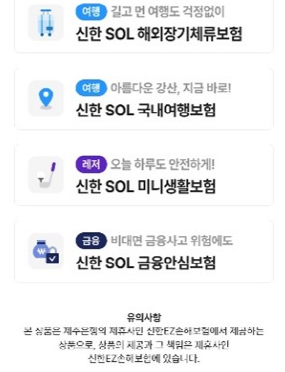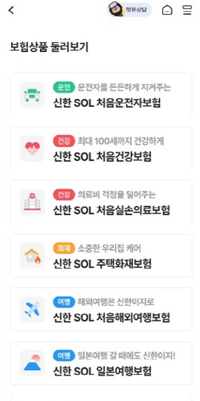주요 상품으로는 신한SOL 처음운전자보험, 신한SOL 처음 건강보험, 신한SOL 처음실손의료보험, 신한SOL 해외여행보험, 신한SOL 해외장기체류보험, 신한SOL 금융안심보험 등이 있다.