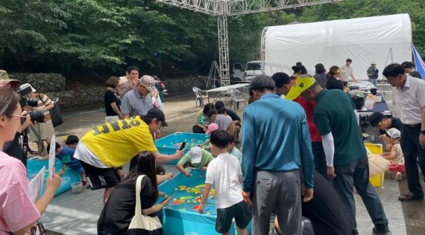 물고기 잡기 체험은 축제 기간 1일 2회 진행되며 가물치, 붕어가 든 튜브에서 물고기를 제일 먼저 잡아 봉지에 넣으면 감자 5㎏ 교환권이 제공된다.