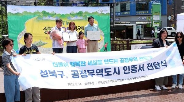 서울 성북구가 2022년에 이어 다시 한번 '공정무역도시'로 인증을 받았다고 20일 밝혔다. 인증 기간은 2025년 6월 14일부터 2027년 6월 13일까지 2년이다.