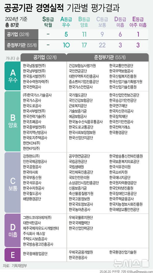 정부는 20일 '제6차 공공기관운영위원회'를 열고 2024년 공공기관 경영평가 결과를 발표했다. 공공기관 경영평가는 탁월(S), 우수(A), 양호(B),보통(C), 미흡(D), 아주미흡(E) 등급으로 점수를 매긴다.