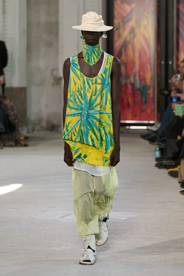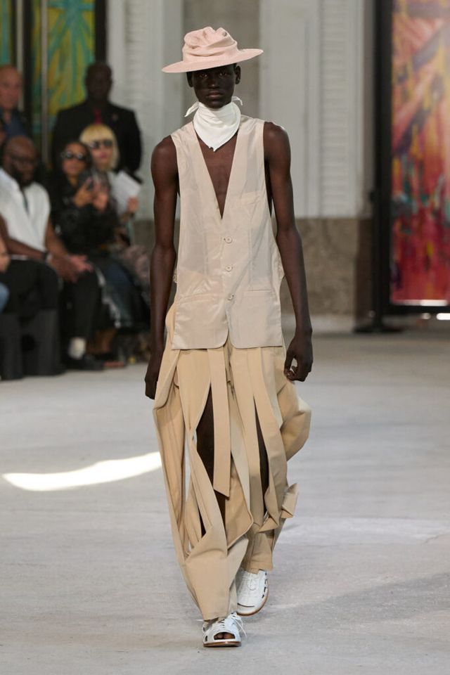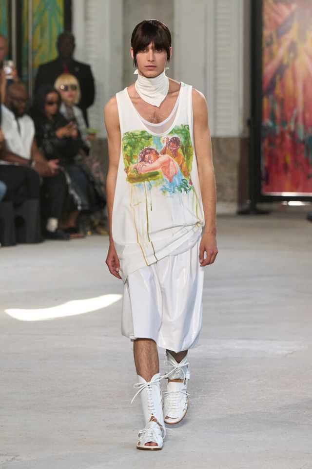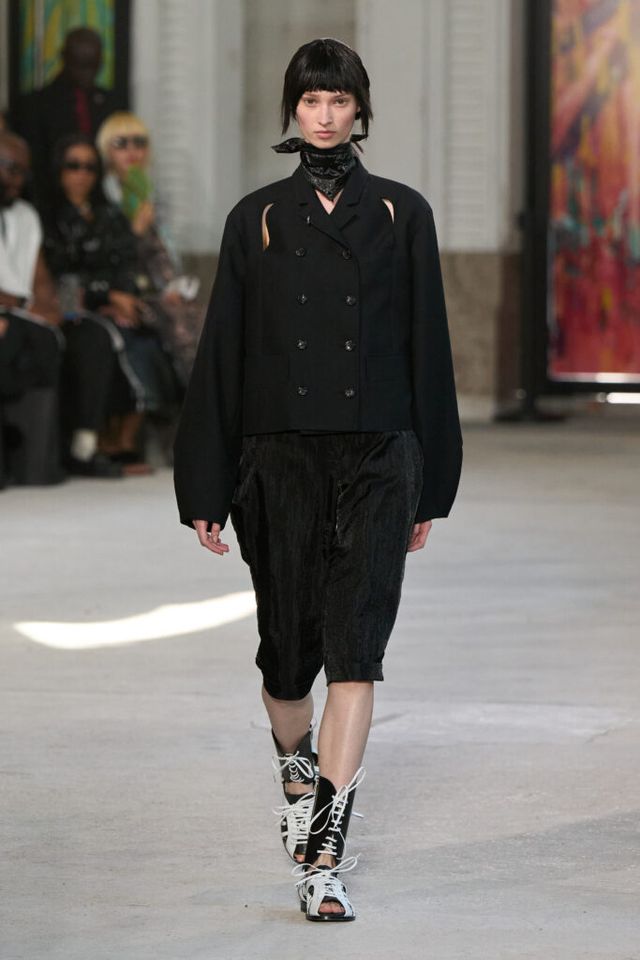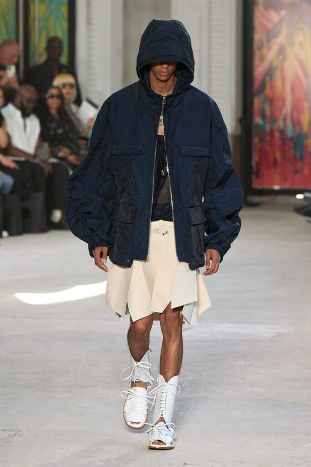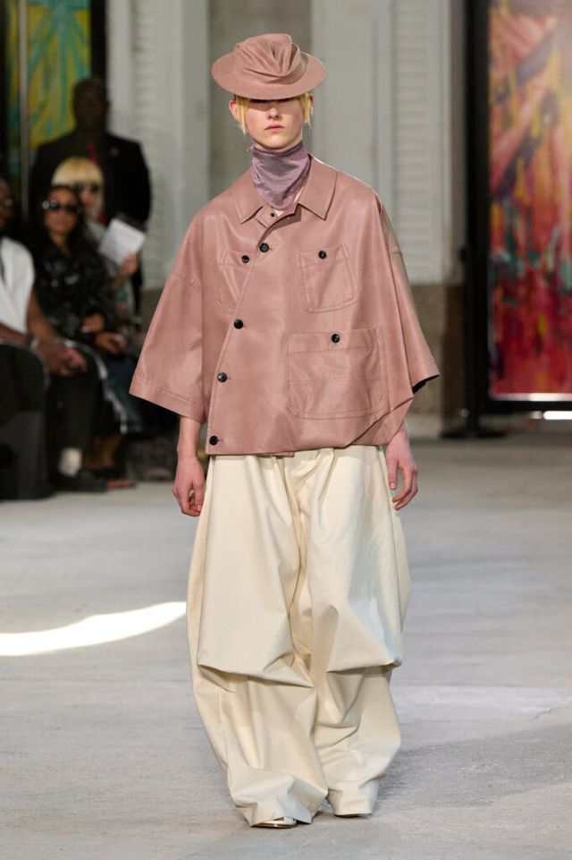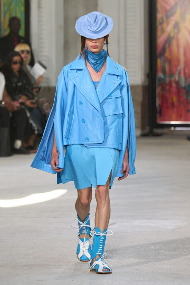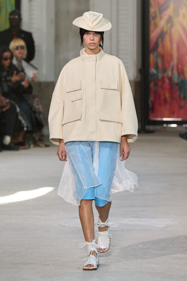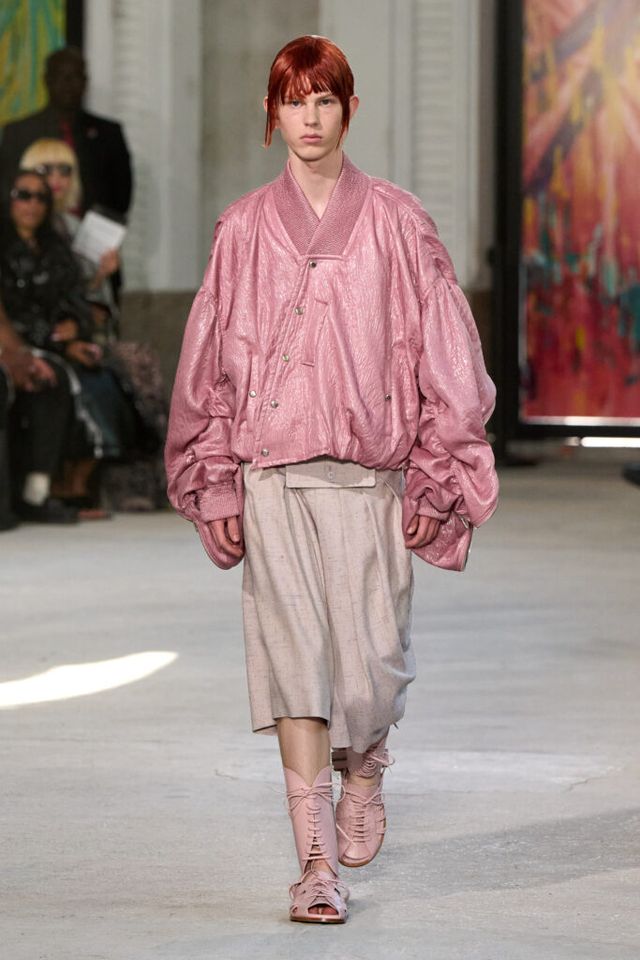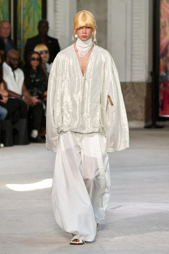 NOTE 첫 여성 컬렉션을 함께 선보여 화제를 모은 2025 S/S 송지오 컬렉션. ‘밝은 별(Bright Star)’이라는 타이틀로 전개한 쇼는 무한한 상상력에 경계 없는 순수성을 지닌 젊은 소년과 수채화에서 영감 받은 요소를 버무려 경쾌한 컬러와 프린트를 선보였다. 봄여름에 어울리는 실크와 오간자 소재의 가벼운 윈드브레이커와 크롭트 팬츠, 블루종도 과거 컬렉션에 비해 경쾌하고 산뜻한 분위기를 더했다.
