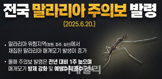 질병관리청은 20일 지난주(6월 8~14일) 말라리아 매개모기 발생이 증가한 것으로 확인돼 말라리아 주의보를 발령한다고 밝혔다.