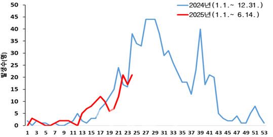 지난해에는 23주차에 말라리아 매개모기 밀도가 발령 기준에 도달했으나, 올해는 전년 대비 1주 늦은 24주에 발령 기준을 충족했다. 이는 5월 전국 평균기온이 16.8도로 평년 대비 0.5도, 전년 대비 0.9도 낮아 매개모기 발생이 감소했기 때문이다.