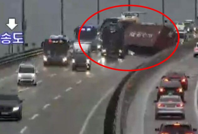 경찰은 컨테이너 고정 작업이 제대로 이뤄지지 않은 상태에서 운행 중 강한 바람이 불자 노면으로 추락한 것으로 보고 사고 원인을 조사하고 있다.