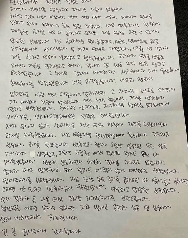 천성훈은 "억울하고 답답한 심정"이라며 "수사 결과가 곧 나올 테니 조금만 기다려주시기를 부탁드립니다"라고 했다.