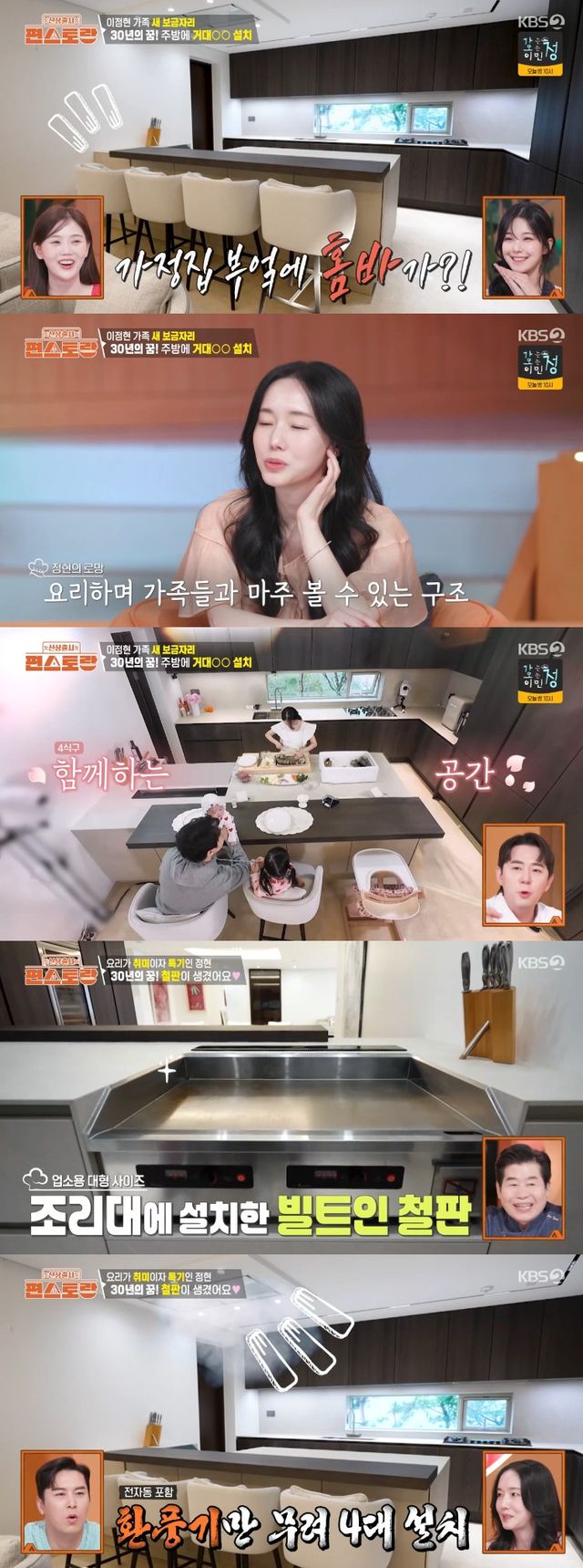 주방에는 넓은 6인 식탁에 이어 바 테이블까지 갖춰져 있었고, '편스토랑' 멤버들이 감탄을 자아내자 이정현은 "가족들이랑 마주 보고 식사를 하고 싶어서 바도 만들었다"고 설명했다.