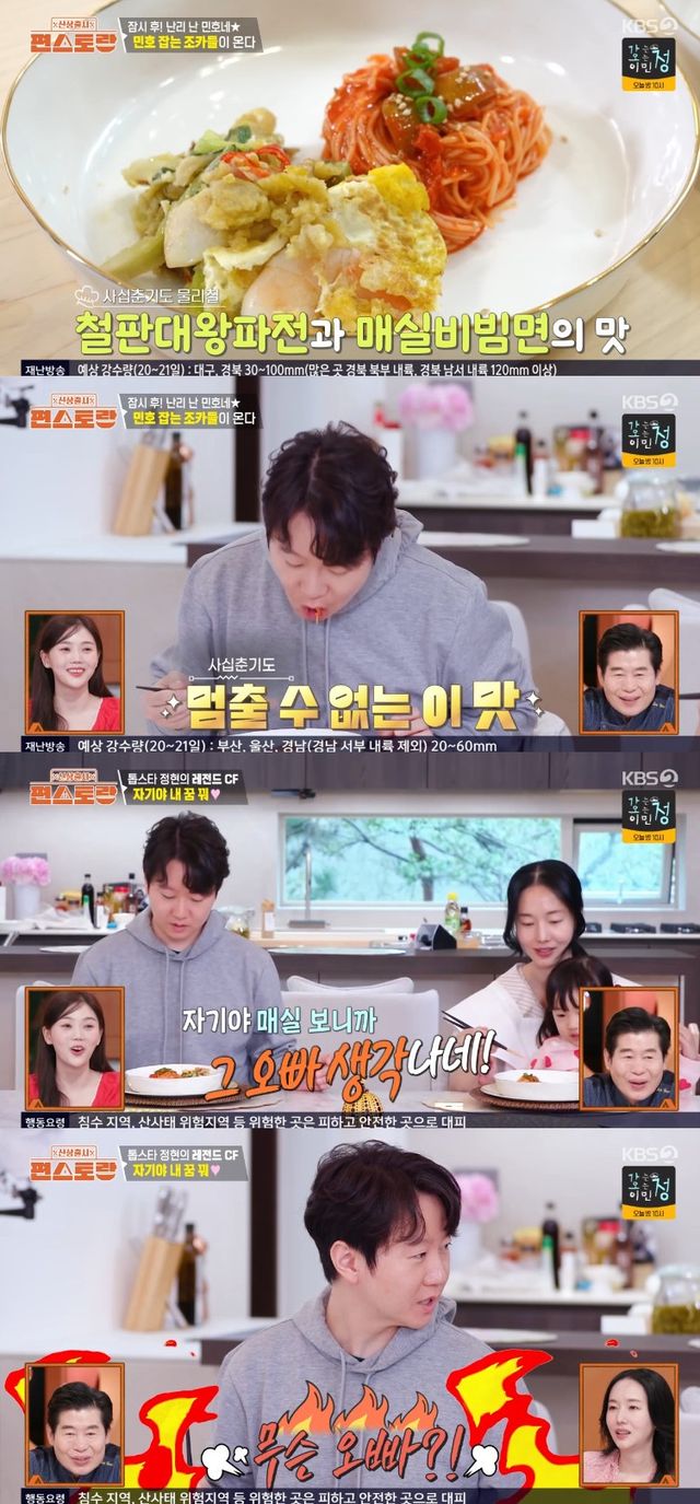 이정현은 "투덜대지만 너무 고마워한다"며 평소 남편의 모습을 언급했고, 이어 붐도 "이 요리를 누가 제일 많이 먹겠냐. 자기님이다"라고 덧붙였다.
