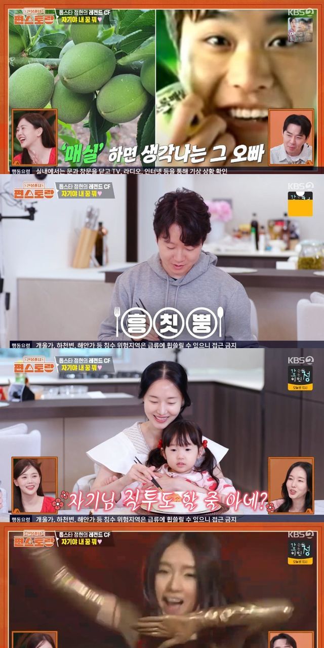 이런 아내의 발언에 남편은 "무슨 오빠"라며 물었고, 이정현은 "초록 매실로 유명했잖아. 성모 오빠가"라며 매실 음료 CF로 한때 '매실 오빠'라고 불렸던 조성모를 언급했다.