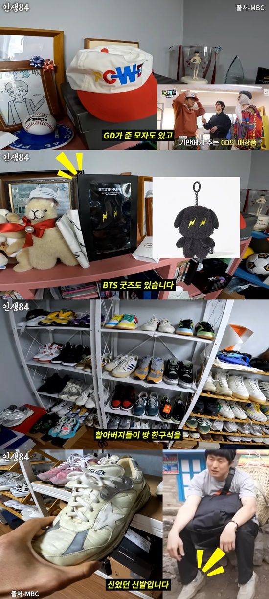 이어 기안84는 “여기는 잡다한 것들을 모아두는 곳”이라며 “지드래곤(GD)이 준 모자도 있고 슬리퍼도 있다. 방탄소년단(BTS) 석진이 준 굿즈도 있다”고 전했다. 그러면서 “방송을 오래 하다 보니 이렇게 생긴 것 같다”며 미소를 지었다.