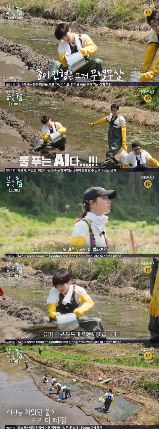 안재현이 자리에 주저앉아 상체만 움직이자 붐은 "물 푸는 AI"라며 마치 기계같은 모습을 언급했고, 이에 이민정은 "AI 버튼 누르면 더 빨라지냐"며 장난을 쳤다.