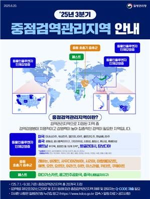 질병관리청(청장 지영미)이 2024년도 해외감염병 발생 상황을 반영하여 2025년 3분기 중점검역관리지역 20개국과 검역관리지역 182개국을 지정하고, 7월 1일부터 시행한다고 발표했다.