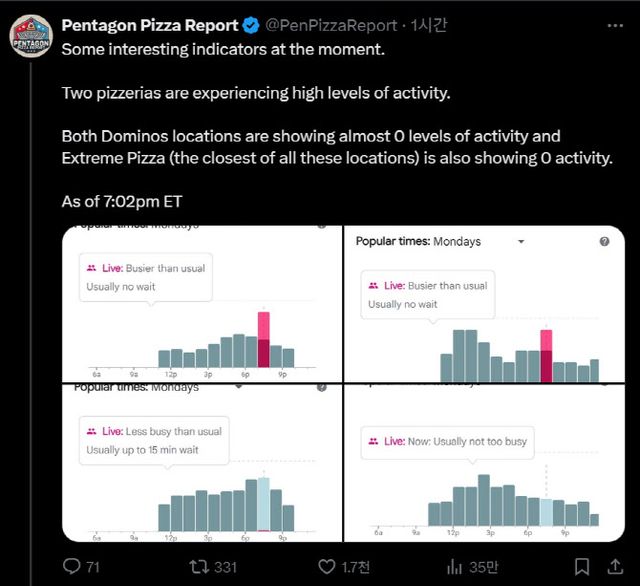 지난 13일 이스라엘이 이란에 기습 공습을 단행했을 때도 펜타곤 피자 리포트는 무언가 ‘이상한 일’이 일어났다는 것을 알아챘습니다. 이달 들어 펜타곤 피자 리포트는 드문드문 게시글을 올리다가, 13일에 “펜타곤 인근 피자집들이 붐비고 있다”는 게시글을 연달아 올렸습니다. 그리고 1시간 뒤, 이란 공영 방송에서 이스라엘의 공습을 발표했죠. 이날 펜타곤 인근 도미노피자는 마감 시간 직전까지 엄청나게 붐볐다고 합니다.