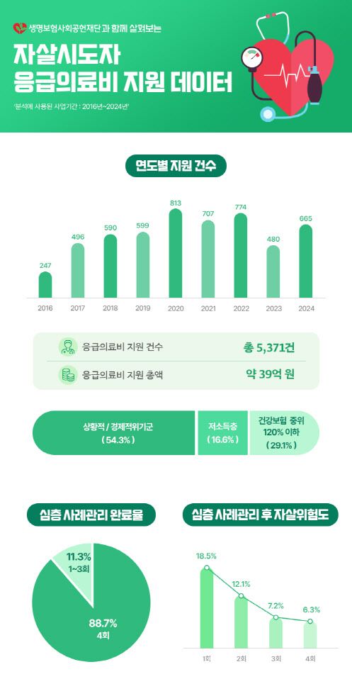 아울러 자살시도자 응급의료비 지원사업도 진행하고 있다. 생보재단은 응급실에 내원한 자살시도자 중 치료비 부담으로 적절한 의료 서비스를 받기 어려운 위기군을 대상으로 치료비를 지원하고 있다. 2016년부터 지난해까지 총 5317명에게 약 39억원의 치료비를 지원했다. 지난해 506명에게 1인당 평균 98만원을 지원했다.