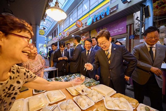 시장에 들어선 이 대통령은 한 분식집에 들러 부추전, 고추튀김, 떡볶이, 순대 등을 직접 구입했다. 인근 가게에서는 식혜와 증편떡도 사 참모진과 함께 나눠 먹었다. 시장 상인들과 시민들은 이 대통령을 반갑게 맞았다. 일부 시민은 "캐나다 순방에서 고생 많았다", "여사님 모습도 보기 좋았다", "건강을 꼭 챙기며 일해달라"는 등의 말로 이 대통령을 격려했다.