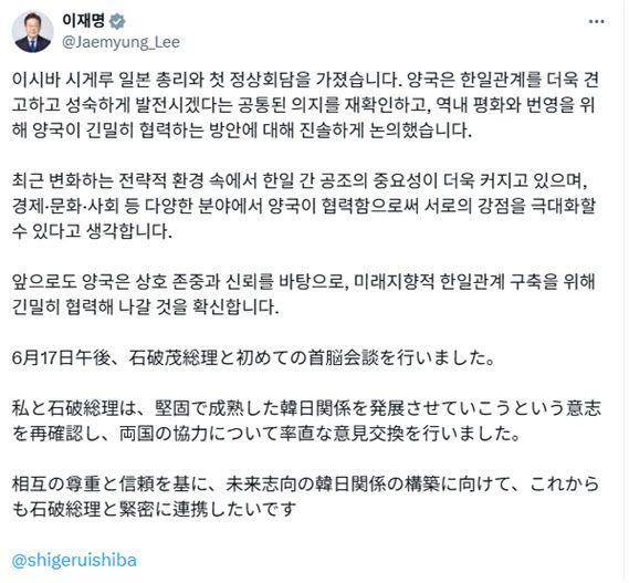 이 대통령 지시에 따라 정상과의 양자회담 관련 메시지는 모두 한국어와 상대국 언어를 병기해 공개됐다. 이시바 시게루 일본 총리 또한 한국어와 일본어를 병기한 글을 SNS에 게재해 디지털 공간에서 상호 존중의 사례로 주목받았다.
