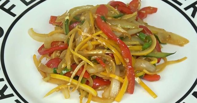 껍질 손질이 끝나면 참외의 양끝을 제거하고 반으로 자른 뒤 껍질을 벗긴다. 이때 과육 쪽으로 채를 썰어야 칼이 미끄러지지 않는다. 채썬 참외껍질과 함께 볶을 야채들도 준비한다. 양파는 얇게 채썰고, 색감을 위해 빨간 피망도 함께 썬다. 오이도 함께 넣는데, 오이의 아삭한 식감이 참외껍질과 잘 어울린다.