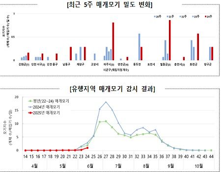 질병관리청은 ‘2025년 말라리아 매개모기 조사감시사업’을 통해 말라리아 위험지역 69개 조사지점에서 24주차(6월 8일~14일) 매개모기 밀도를 감시한 결과, 일일 평균 모기지수가 0.5 이상인 감시 지점이 3곳에 달해 주의보 발령 기준을 충족했다고 발표했다.