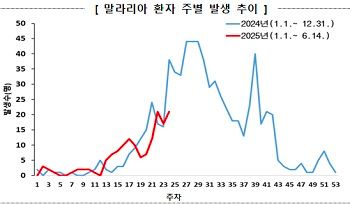 2025년 국내 말라리아 환자는 24주(1월 1일~6월 14일)까지 총 130명으로 전년 동기간(143명) 대비 9.1% 감소했다.